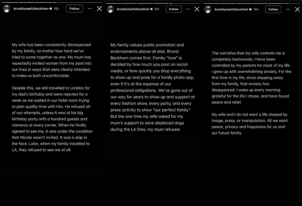 Brooklyn Peltz Beckham v zaključku svojih objav poudari, da si z ženo ne želita življenja, ki bi ga oblikovali mediji, manipulacija ali nenehna javna izpostavljenost. Njuna želja je po njegovih besedah preprosta: mir, zasebnost in sreča, ter možnost, da sama gradita svojo prihodnost.