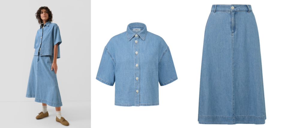 Kolekcija ne gradi na izrazitih modnih presežkih, temveč na preverjenih elementih, ki se iz sezone v sezono vračajo v nekoliko posodobljeni podobi. Denim ostaja osrednji material, a v mehkejši, bolj tekoči različici, ki se prilagaja telesu in gibanju. Dopolnjujejo ga zračne tkanine in silhuete, zasnovane z mislijo na udobje, kar je tudi sicer ena pomembnejših smeri sodobne ženske mode.